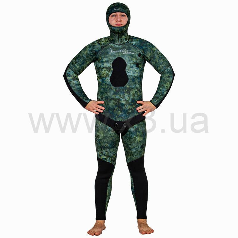 Гидрокостюм Marlin Phantom (Марлин Фантом) – гидрокостюм для подводной охоты, изготовленный из неопрена Nam Liong. Анатомический крой состоящий из 29 деталей обеспечивают комфорт при длительном использовании. Наружное покрытие – ультрастрейч, обладает повышенной эластичностью, внутренняя поверхность – открытая пора. Куртка имеет крой типа реглан, который увеличивает комфорт и создаёт максимальное прилегание гидрокостюма при эксплуатации. Для облегчения дыхания (на моделях 7, 9 и 10 мм) - майка комбинезона (Long John) выполнена из неопрена меньшей толщины. Материал duratex (дюратекс) защищает колени и локти костюма от преждевременного истирания.