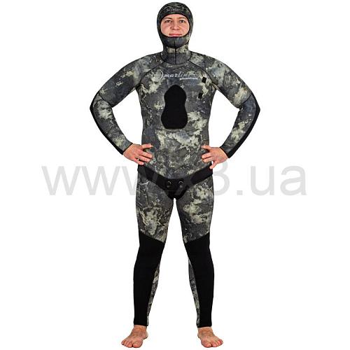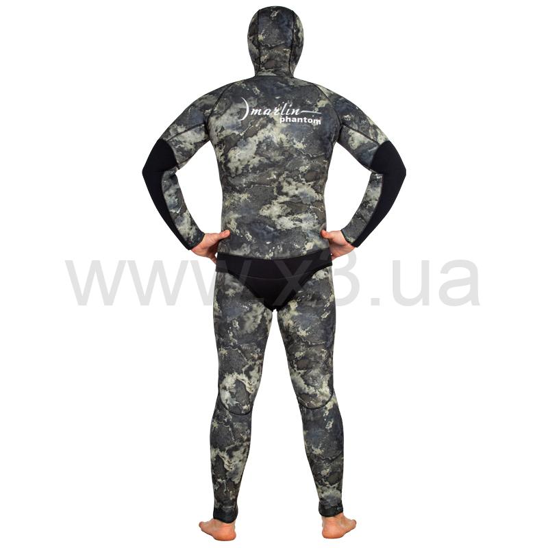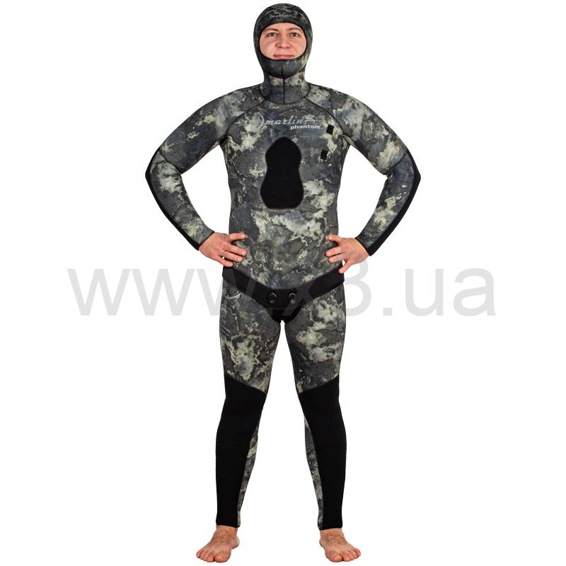 Гидрокостюм Marlin Phantom (Марлин Фантом) – гидрокостюм для подводной охоты, изготовленный из неопрена Nam Liong (Нам Лионг). Мягкий эластичный неопрен марки 3D (в моделях 5 и 7 мм), анатомический крой состоящий из 29 деталей обеспечивают комфорт при длительном использовании. Наружное покрытие – ультрастрейч, обладает повышенной эластичностью, внутренняя поверхность – открытая пора. Куртка имеет крой типа реглан, который увеличивает комфорт и создаёт максимальное прилегание гидрокостюма при эксплуатации. Для облегчения дыхания (на моделях 7, 9 и 10 мм) - майка комбинезона (Long John) выполнена из неопрена меньшей толщины. Материал duratex (дюратекс) защищает колени и локти костюма от преждевременного истирания.