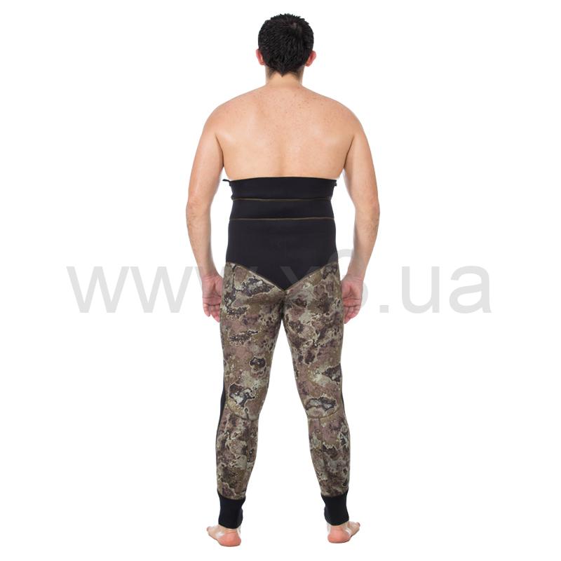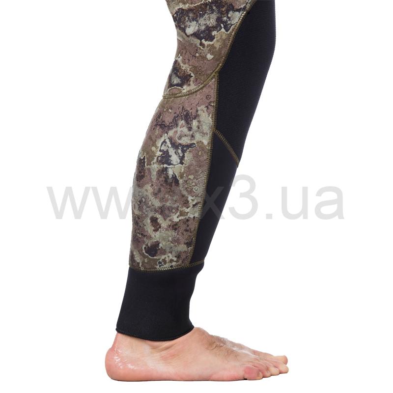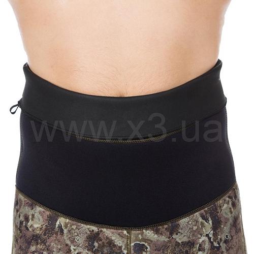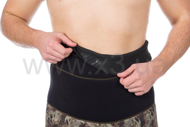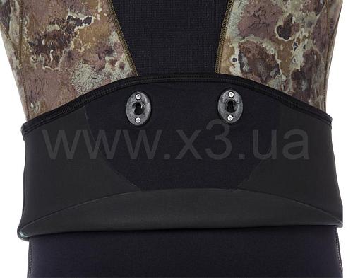 Справа на груди имеется крепление для ножа в виде строп пришитых по специальной технологии, которая не позволяет воде проникнуть сквозь шов в костюм. Для надежного крепления ножен разной длины каждый отрезок стропы имеет по три ячейки. Ножны можно закрепить с помощью пластиковых стяжек.