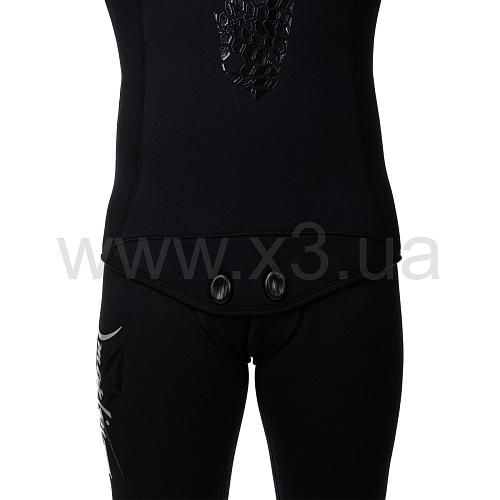 Куртка имеет крой типа реглан, который увеличивает комфорт и обеспечивает максимальное прилегание гидрокостюма. Полиуретановый нагрудник защитит ткань гидрокостюма в процессе заряжания ружья, а его продуманный дизайн не помешает дышать полной грудью. Брюки костюма с высокой талией, без лямок. Колени защищены прочным к истиранию материалом Duratex. На швах манжет рукавов и штанин гидрокостюма имеются специальные закрепки, позволяющие откорректировать длину рукавов и штанин в домашних условиях. В гидрокостюмах толщиной 7 мм все края костюма обработаны оверлоком, а в толщине 9 мм оверлок на краях отсутствует.