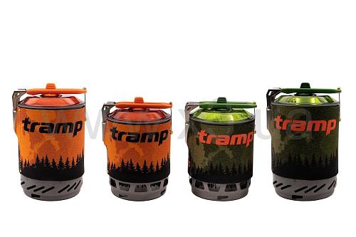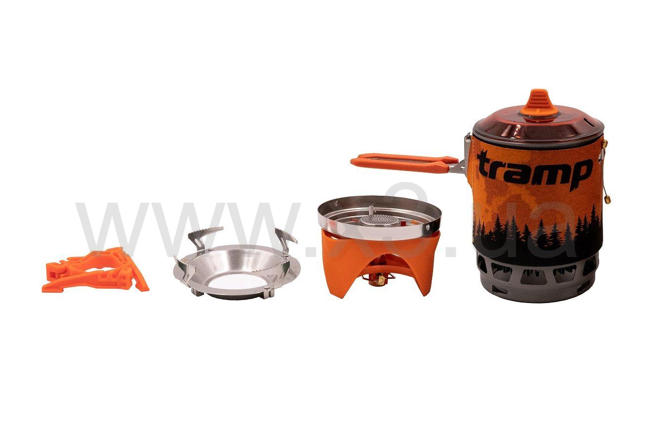 Интегрированная система приготовления пищи Tramp состоит из котелка на 1 литр в неопреновом чехле со встроенным в ветрозащитный экран радиатором – теплообменником и подключаемой к нему газовой горелки, а так же подставки под газовые баллоны и таганка для использования другой посуды в режиме обычной горелки.