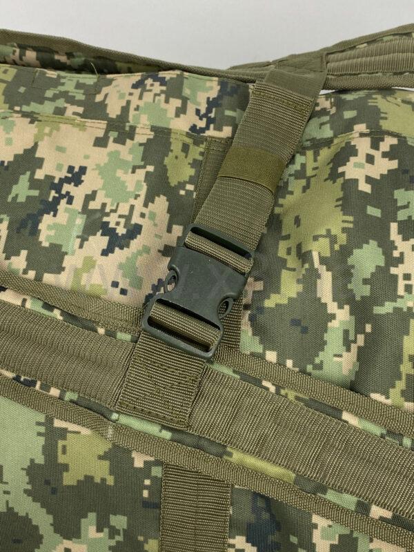 Сумка имеет две широкие ручки, одновременно выступающие лямками, если носить ее как рюкзак. На лямки можно цеплять молле-совместимые элементы, а их длина регулируется ремнем с рамкой.