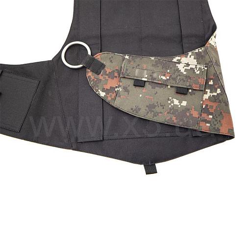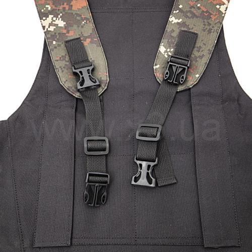 Сброс данного жилета происходит в одно движение. Фастекс легко нащупывается пальцами даже в толстой зимней рукавице. После нажатия фастекса его половинки проскальзывают сквозь удерживающие кольца, и жилет беспрепятственно покидает охотника. Использование высококачественной фурнитуры и нейлона плотностью 600 DEN повышает износостойкость. Также жилет имеет петлю для крепления стопора под ремень.
