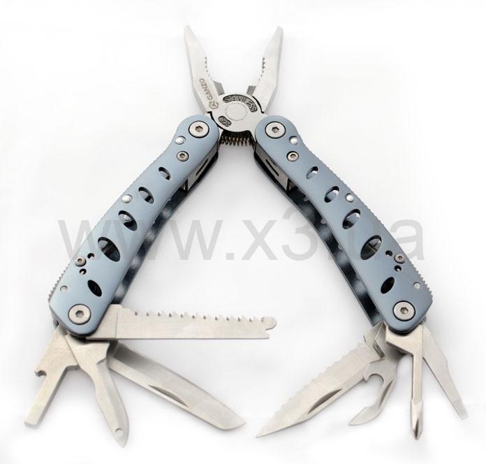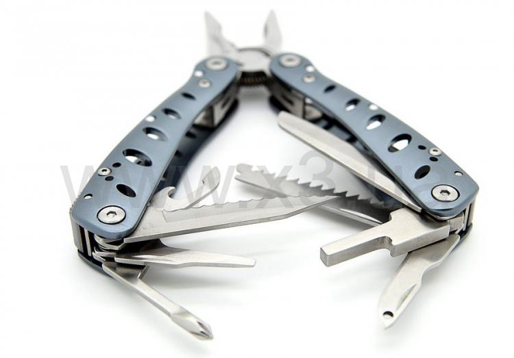Инструменты: кусачки, плоскогубцы, маленькая отвертка плоская, крестообразная отвертка, нож, нож с зубчатым лезвием, открывалка для бутылок, консервный нож, для снятия изоляции, пила, шило, держитель бит. Кроме того, в комплекте идет 10 насадок для отверток.