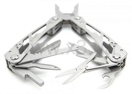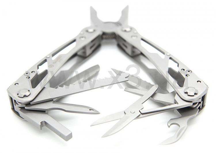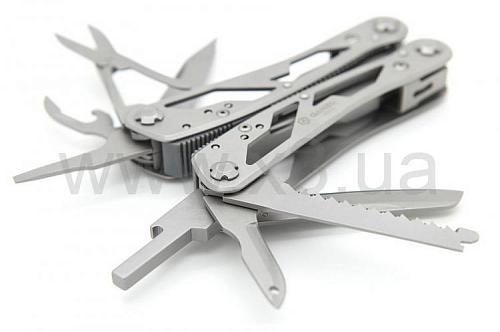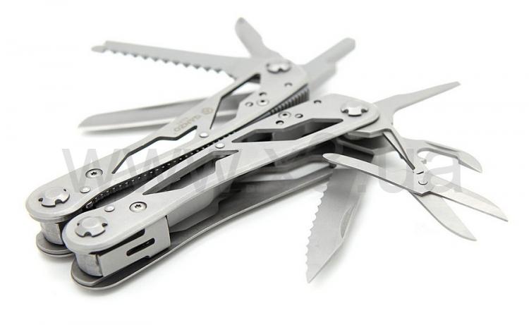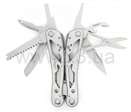 Инструменты: кусачки, плоскогубцы, маленькая отвертка плоская, нож, нож с зубчатым лезвием, пила, шило, открывалка для бутылок, консервный нож, ножницы, инструмент для снятия изоляции, держатель бит. Кроме того, в комплект входит 12 сменных насадок для отверток.