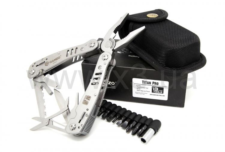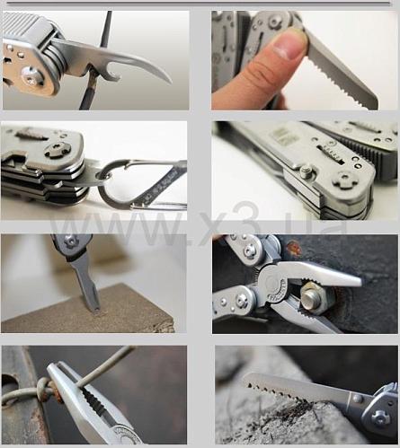 Инструменты: кусачки, плоскогубцы, маленькая отвертка плоская, нож, нож с зубчатым лезвием, пила, шило c петлей, открывалка для бутылок, консервный нож, ножницы, инструмент для снятия изоляции, держатель бит, стропорез, крепление к подсумку. Кроме того, в комплект входит 12 сменных насадок для отверток.