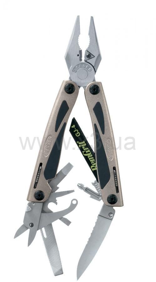 Мультитул оснащен 11 функциями: плоскогубцами, кусачками из особо прочных карбид-вольфрамовых сменных вставок, ножом с комбинированной заточкой (прямой и серрейторной), пилой, тремя плоскими отвертками (маленькая, средняя, большая), отверткой крестообразной, напильником, открывалкой для консерв, ножницами.