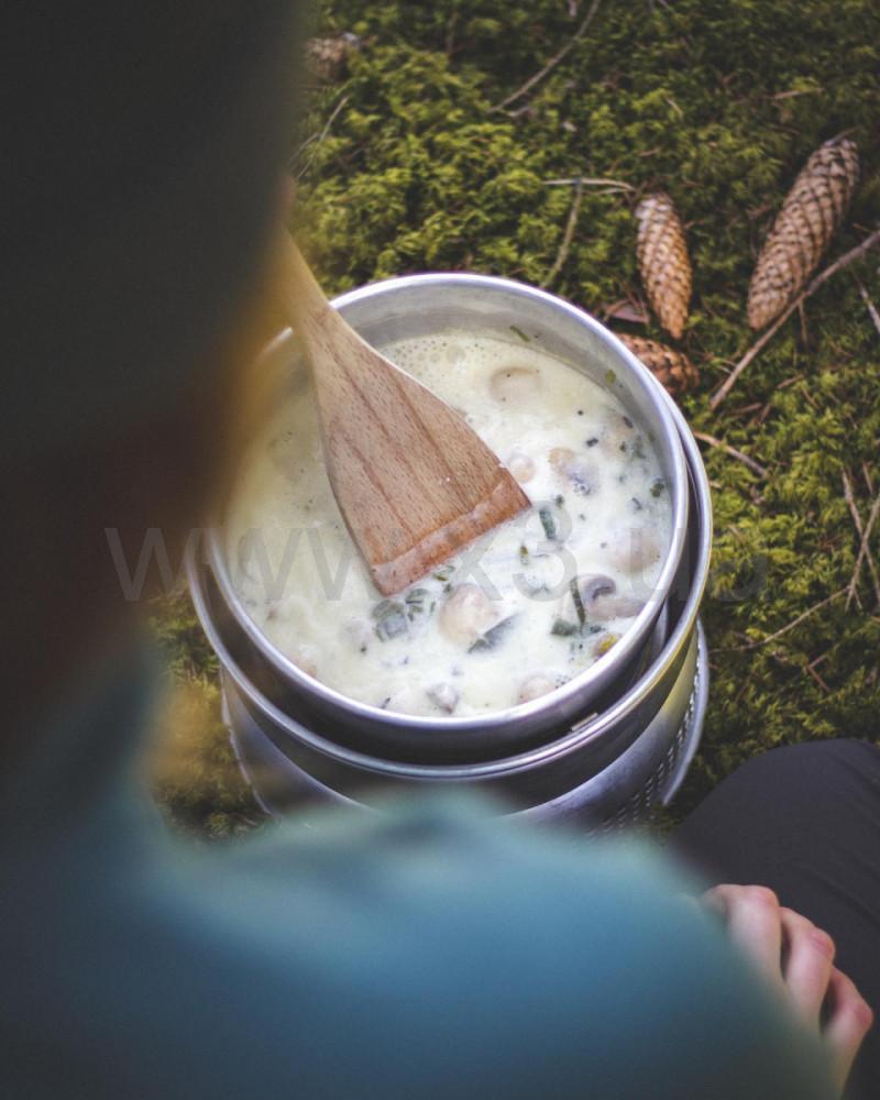 Duossal 2.0 — материал, где сочетаются лучшие качества алюминия и стали. Наружные стенки посуды сделаны из алюминия, который имеет низкий вес (это важно для туристических походов, где снаряжение несут на плечах) и отличную теплопроводность (пища быстро готовится, экономя ваше время и топливо). На внутренней стороне находится слой нержавеющей стали – очень прочного металла, поверхность которого почти невозможно поцарапать. Даже после длительной эксплуатации стальные стенки остаются гладкими и их легко мыть: так же, как любимую домашнюю кастрюлю. Сталь хорошо удерживает тепло и равномерно прогревает пищу, не накапливает запахи и не меняет вкус продуктов. Два металла надежно соединены под высоким давлением*. Слой стали очень тонкий — всего 0.3 мм, толщина алюминия — 0.5 мм, поэтому Duossal 2.0 получается легким, как алюминий, и обладает долговечностью стали.