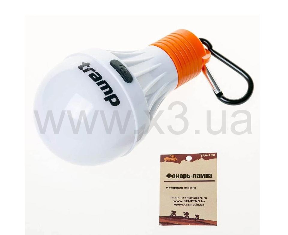 Легкая кемпинговая фонарь-лампа Tramp TRA-190 из пластика. Корпус выполнен в виде обыкновенной бытовой лампочки. Дает мягкий рассеяный круговой свет. Имеет три режима — яркий, экономный и сигнальный (бипер). Можно удобно держать в руке и исвещать пространство как свечей, можно подвесить на какбинчике под крышей палатки, на ветку дерева, или на оттяжку тента.
