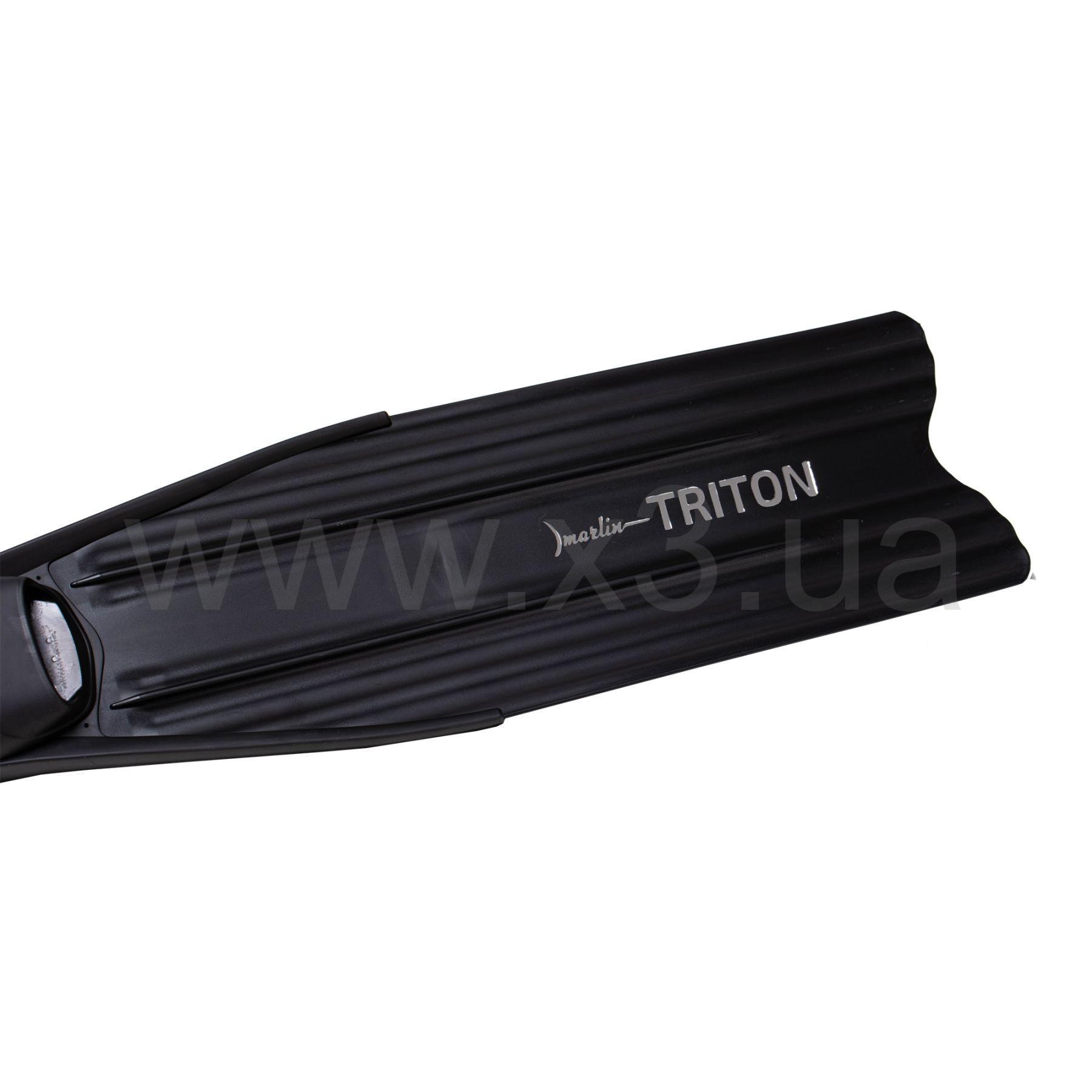 Ласты Marlin Triton (Марлин Тритон) – легкие ласты для подводной охоты и фридайвинга. Фиксированная лопасть изготовлена из полипропилена, имеет среднюю жесткость. Удобная калоша изготовлена из термопластичной резины с разной степенью жесткости. Жесткая подошва увеличивает передаваемую энергию, мягкий верх обладает хорошей эластичностью обеспечивает удобство одевания и комфорт при длительном использовании. Благодаря слому лопасти в 17 градусов, обеспечивается оптимальный угол наклона ласты к плоскости стопы, в результате чего снижается нагрузки на мышцы стопы и голени. Расположенные по всей длине лопасти направляющие потока предотвращают занос лопасти на бок.