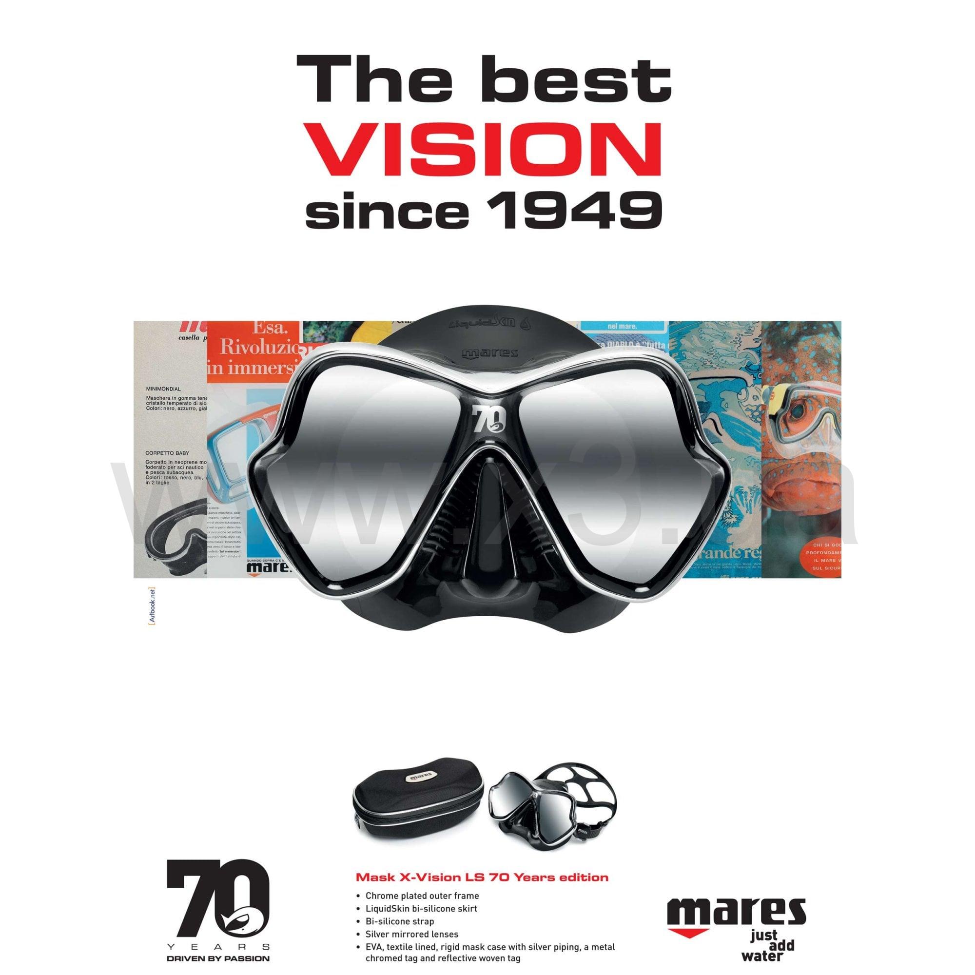Маска Mares X-VISION LS 70 Years имеет уникальный революционный дизайн и сочетает в себе инновационные технические решения для повышения комфорта. Также используется специальная технология Liquidskin, силикон, который на 45% мягче и на 270% эластичнее обычного силикона. Маска X-VISION LS 70YEARS EDITION имеет зеркальное покрытие линзы и хромированую рамку. Дизайн маски X-VISION LS получил награду Reddot Design Award!