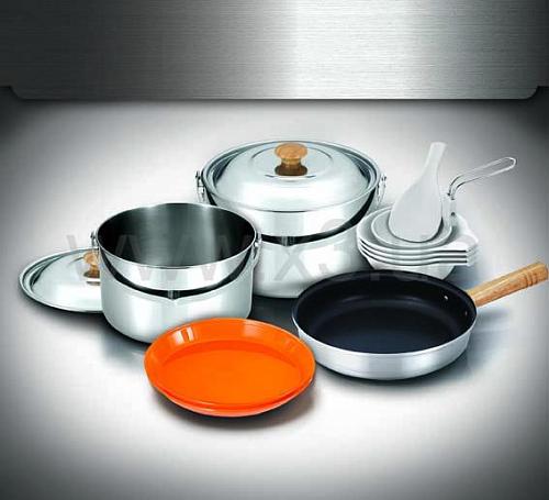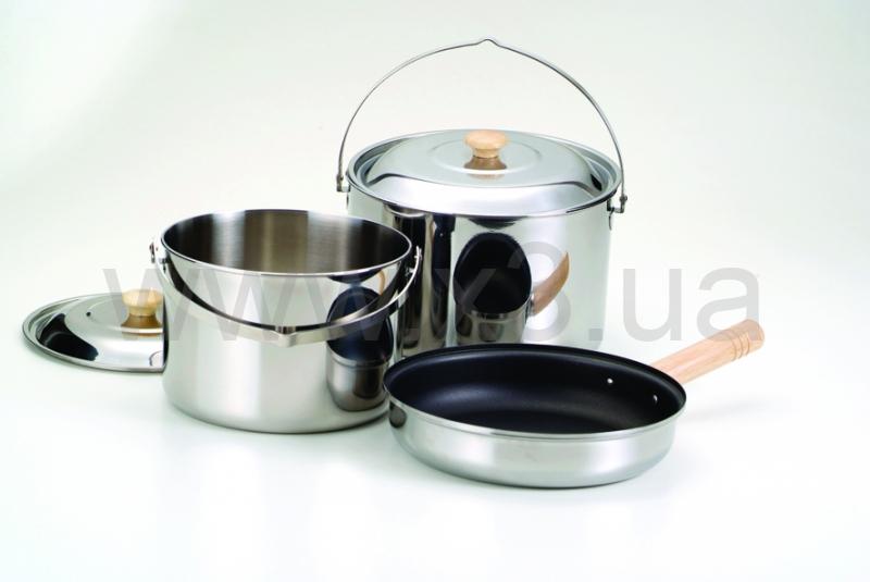 Набор посуды – удачный выбор для тех, кто даже на природе не может отказать себе в удовольствии готовить в высококачественной посуде. Кастрюли из толстой нержавейки не имеют пластмассовых частей, не деформируются от температуры, легко моются, и пища в них меньше пригорает. Благодаря этому их можно ставить на угли и даже вешать над костром. Сковороду со съемной ручкой можно ставить как на угли, так и в духовку. Набор посуды сделает готовку приятнее и в кемпинге, и на рыбалке.