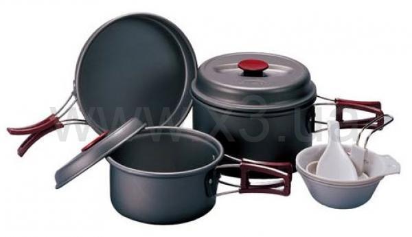 Набор туристической посуды рассчитан на приготовление пищи для 2-3 человек. В набор входять: две кастрюли с крышками, объемом 1,8 и 0,8 литра соответственно, сковорода, чашки, тарелки, половник и лопатка. Кастрюли и сковородка изготовлены из высококачественного анодированного алюминия, из пластика изготовлены кружки, тарелки, лопатка и половник.