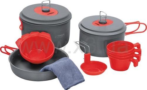 Набор посуды из анодированного алюминия для 3-4 человек, состоит из двух котелков, крышки-сковородки. В набор также входят комплект из мисок и чашек для четырех человек, черпак и тряпка для мытья посуды. Набор упакован в удобный сетчатый чехол.