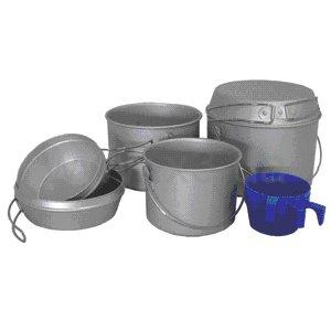 Туристический набор посуды весом 830 г изготовлен из алюминия. Состоит из 6 предметов, которые компактно складываются друг в друга и упаковываются в тканевый мешочек, благодаря чему набор занимает мало места.