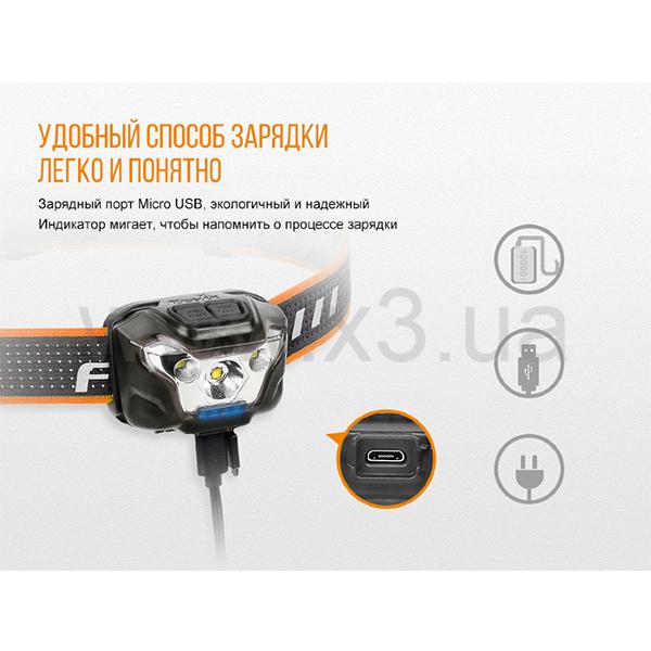 Аккумуляторы для фонаря Fenix HL18R можно заряжать непосредственно внутри батарейного отсека, подключив power-банк через кабель USB. Этот кабель есть в комплекте с фонарем. О том, когда потребуется зарядка, пользователь узнает благодаря интегрированному индикатору. Он включается каждый раз при включении фонаря, а также по желанию владельца – во время использования Fenix HL18R.