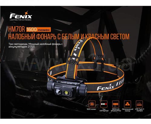 Фонарь модели Fenix HM70R, аккумулятор Fenix ARB-L21-5000 литий-ионный, кабель зарядный USB Type-C, запасное уплотнительное кольцо, инструкция пользователя, талон гарантии.
