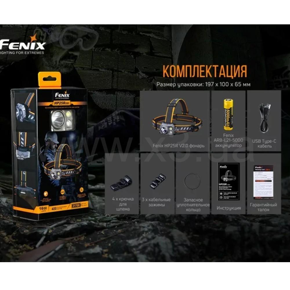 Комплектация: Фонарь Fenix HP25R V2.0, аккумулятор Fenix ARB-L21-5000, зарядный кабель USB Type-C, четыре крепёжных крючка для шлема, три клипсы для кабеля, запасное уплотнительное кольцо, инструкция к применению, талон гарантии.