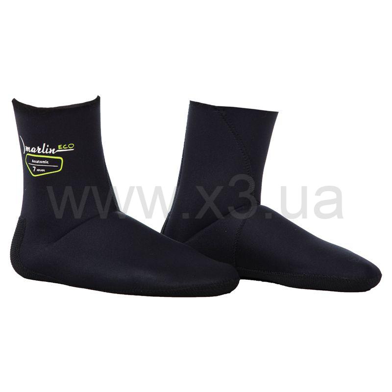Носки Marlin Anatomic Nylon Eco (Марлин Анатомик Нейлон Эко) выполнены из эластичного неопрена фирмы Sheico L, имеют анатомический крой (правый, левый). Внутри - нейлон, наружное покрытие – нейлон. Подошва для лучшей износостойкости выполнена из более жёсткого компрессионного неопрена и усилена материалом дюратекс. Швы проклеены специализированным неопреновым клеем.