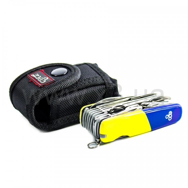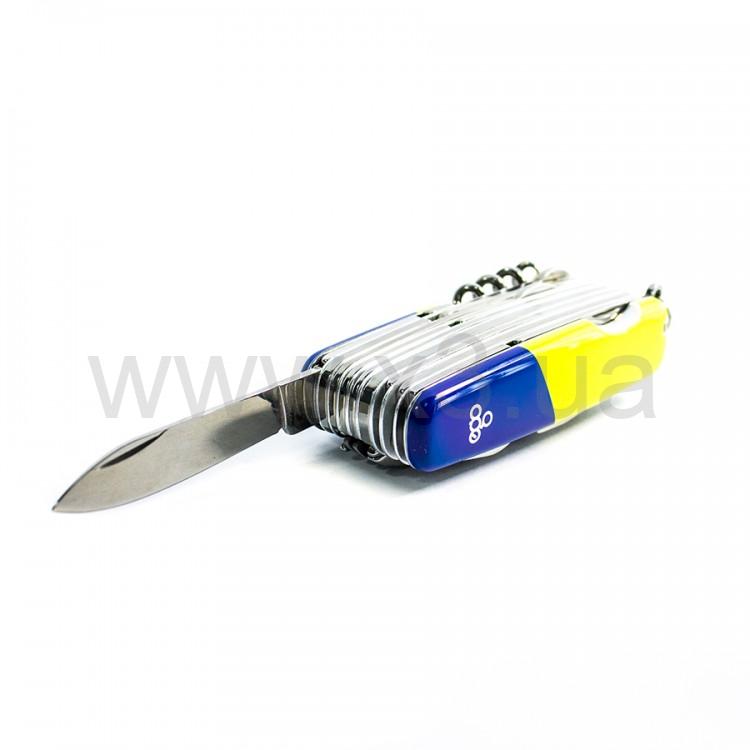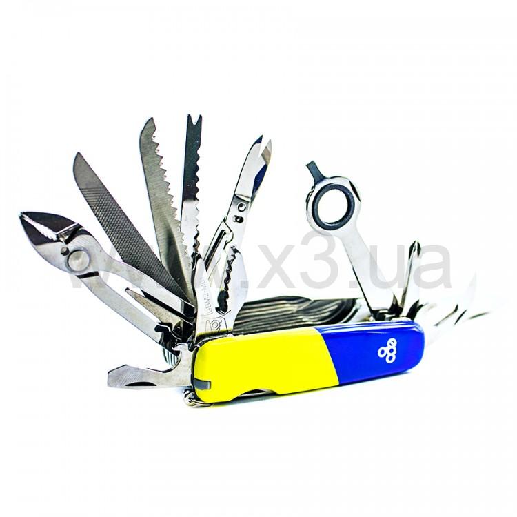 Дополнительные функции: большой клинок, малый клинок, пила по дереву, напильник, консервный нож, открывалка, ножницы, плоскогубцы, кусачки, лезвие для чистки рыбы, лупа, крестовая отвёртка, тонкая отвёртка, шило, штопор, крючок, пинцет, зубочистка, игла