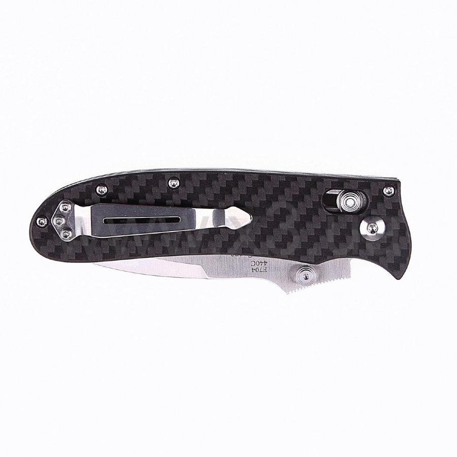 Нож F7041-CF сразу понравился всем, как только появился на рынке. Он универсален и прочен, производитель продумал каждую мелочь. Форма клинка классическая – drop-point, с приспущенным к острию обухом. Изготавливается он из высококачественной стали 440С с твёрдостью 58 HRC. Фиксирует клинок в закрытом и открытом положении механизм G-Lock, который показывает высочайшую надёжность.