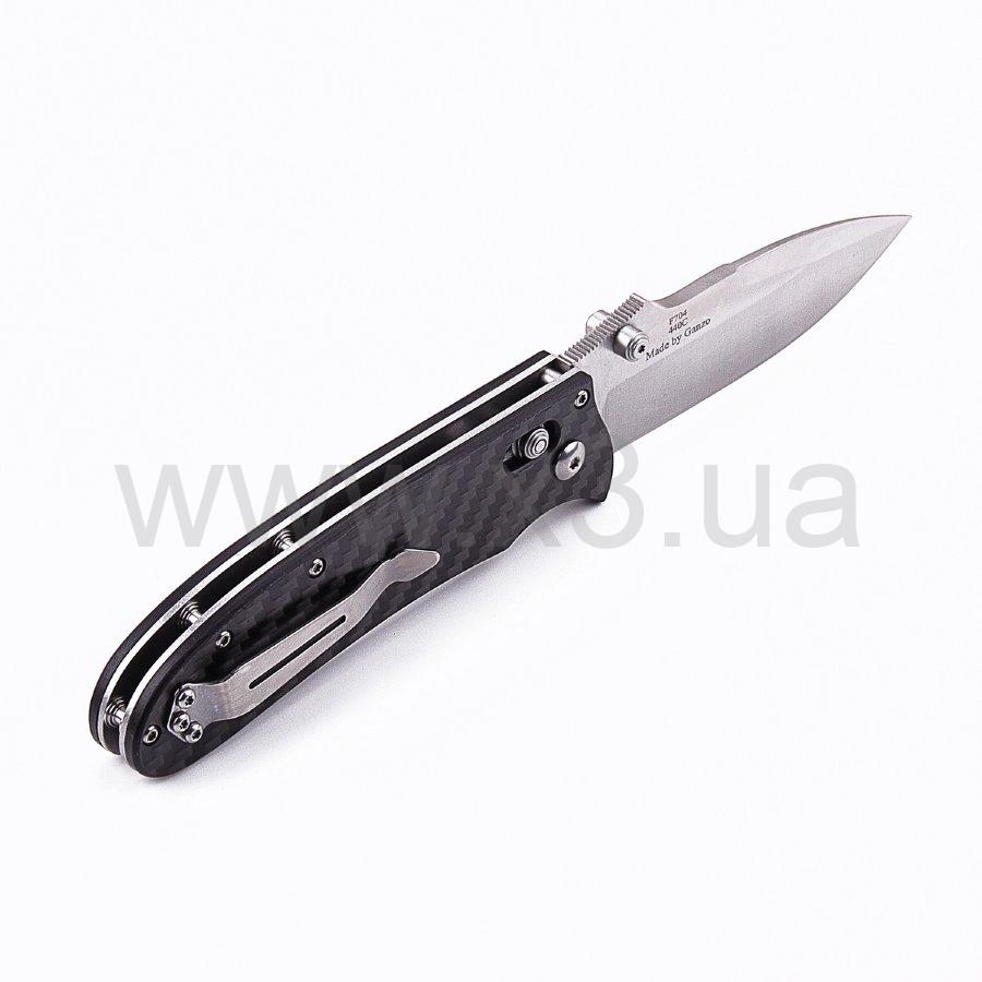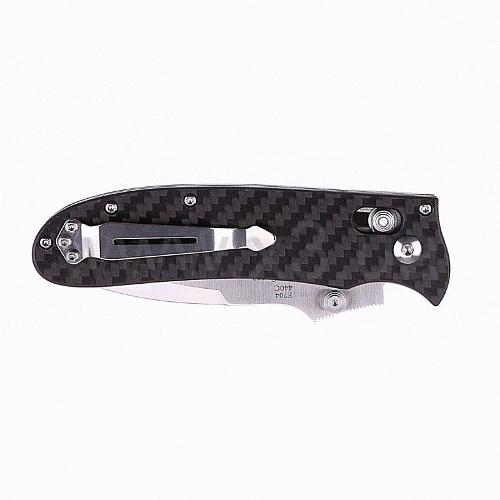 F7041-CF от Ganzo стильно выглядит, но при этом практически идеально сбалансирован. В рабочем положении его длина составляет 20 сантиметров, лезвие – 8,5 см. На обухе есть особые насечки, предназначенные для рабочего пальца, что значительно повышает удобство работы и сцепление.