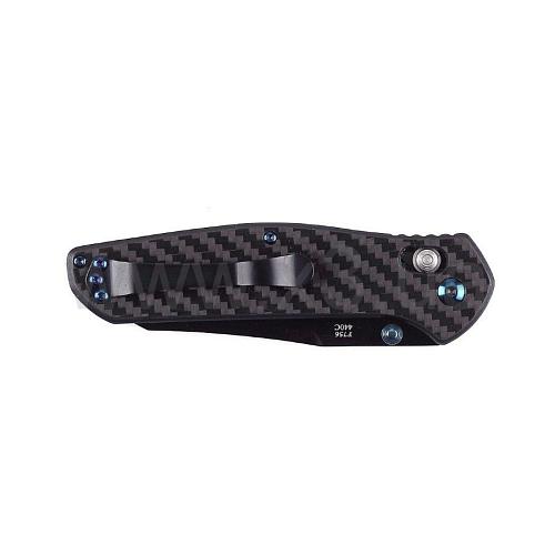Рукоятка изготовлена из композитного материала «carbon fiber», в основу которого легла углеродная ткань. Это придаёт ручке лёгкость, но повышенную жёсткость и прочность. Текстура материала делает нож очень симпатичным, также она совершенно не скользит даже во влажной руке. Форма рукояти также продумана инженерами Ganzo – работать им одно удовольствие.