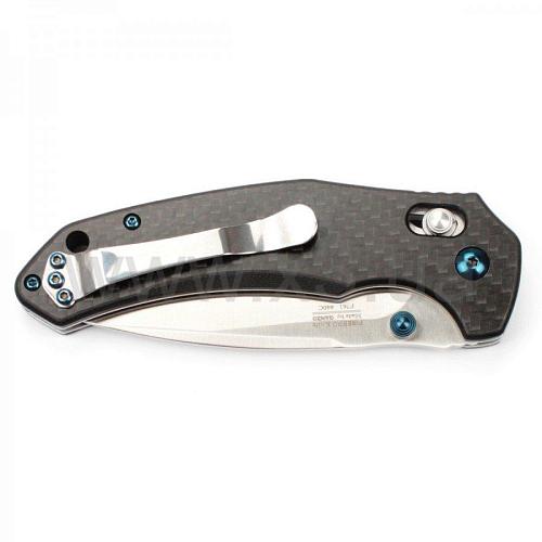 Рукоять складного ножа F7611-CF имеет довольно простую конструкцию. Она состоит из двух стальных лайнеров и пары карбоновых накладок. Этот полимер не восприимчив к коррозии, температурным перепадам и по прочности может быть сравним со сталью. К тому же, за счёт неоднородной структуры, рукоять ножа смотрится крайне эффектно.