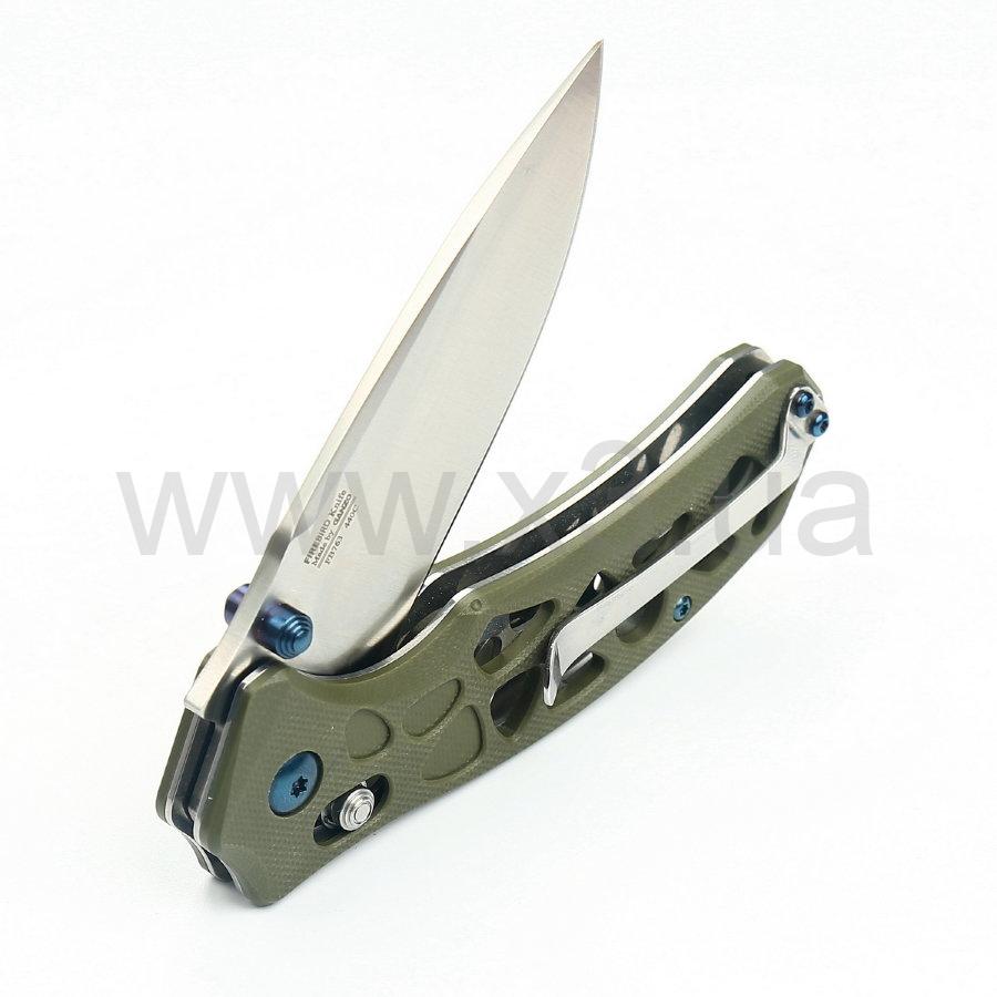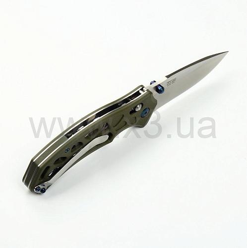 Клинок этого ножа выполнен в форме Drop-point и обладает прямой заточкой режущей кромки, благодаря чему он отлично подходит для выполнения ровного и аккуратного реза, что наверняка будет полезно при работе с продуктами, тканью, картоном, пластиком и другими материалами. Для его изготовления применяется сталь с маркировкой 440С, закаленная до уровня ~58 HRC, благодаря чему лезвие получилось прочным, долговечным и стойким к коррозии. В открытом положении оно фиксируется с помощью замка Axis-lock.