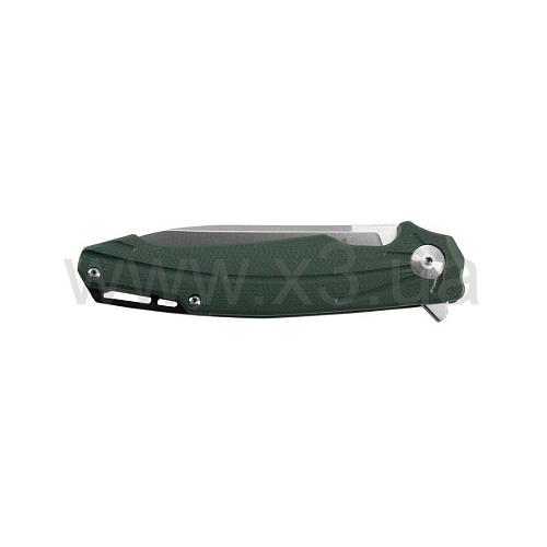 Рукоятка ножа сделана максимально удобной для длительной работы с инструментом. Она получила сдержанность современный дизайн. Накладки для ручки сделаны из композитного стеклопластика G10. В данной модели они могут быть окрашенными в черный, серый или оливково-зеленый цвет. Поверхность рукоятки тире текстурная и дополнительно украшена несколькими желобками. Благодаря этому нож не будет проскальзывать даже в мокрых ладонях. Предусмотрели производители и отверстие для крепления темляка.