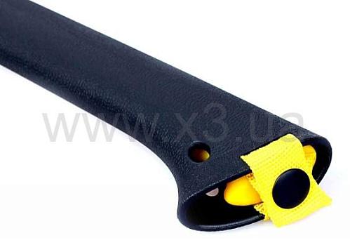 Еще один элемент набора используется для безопасной переноски топора — это специальный чехол, который целиком закрывает острую рубящую кромку. Он сделан из ярко-желтого пластика и плотно удерживается на топоре. У чехла предусмотрена удобна ручка, за которую топор можно носить, когда он не используется.