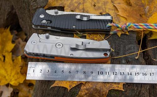 Для ручки ножа производители выбрали все ту же нержавеющую сталь, а также современную разновидность стеклопластика - G10. Он относится к композитным материалам с высокой прочностью и способностью противостоять основным видам коррозии. Покупатели могут выбирать ножи с накладками трех различных цветов: классического черного, зеленого или оранжевого. С обратной стороны ручки расположена металлическая стальная клипса для закрепления ножа в кармане или на поясе.