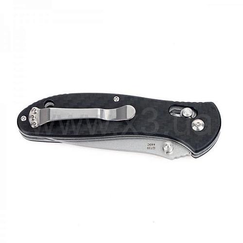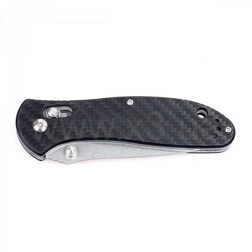 Нож Ganzo G7392-CF - лезвие в данной модели — гладкое. Этот способ заточки признан универсальным, поскольку подходит для большинства материалов, которые нож будет резать ровно и аккуратно. Сама же поверхность лезвия выглядит почти матовой, ведь она обработана методом грубой шлифовки Stonewash. Это популярный метод обработки, который позволяет скрыть многие появляющиеся со временем царапины на клинке ножа. Покупатели также отдают ему предпочтение за то, что на таком ноже не остаются отпечатки пальцев, а в лучах солнца он практически не блестит.
