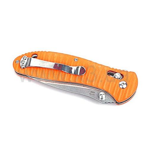 Рукоятка Ganzo G7392Р — пластиковая. Две накладки с волнистой поверхностью прикручены с каждой стороны металлической основы. Цвет этих накладок может быть, по выбору покупателя, черным, оранжевым или зеленым.