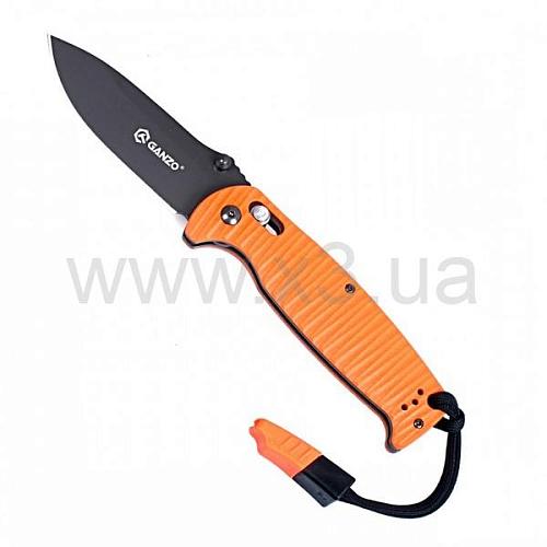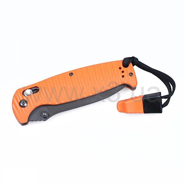 Рукоятка ножа оранжевого или же черного цвета изготавливается из стеклопластика. Такой материал позволяет сделать нож, в целом, более легким, но обеспечивает ему достаточный запас прочности и долговечности, чтобы Ganzo G7413Р можно было свободно использовать на рыбалке, в походе или для выполнения разнообразных задач в городе. Кстати, для использования ножа в туристических целях, очень удобно, что эта модель продается сразу с темляком и свистком.