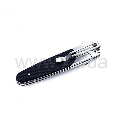 Рукоятка ножа Ganzo G743-1 комбинированная. Участок около клинка, примерно на треть длины, также сделан стальным и обработан тем же методом, что и лезвие. На остальной части, с обеих сторон рукоятки закреплены накладки из композитного стеклопластика, известного под названием G10. Они прикручены к основе двумя небольшими болтами. Поверхность накладок — шероховатая за счет нанесения мелкой накатки. Это помогает держать нож в руках крепче даже, если ладони влажные. С одной стороны рукоятки закреплена клипса, также выполненная из стали. Возможность ее переустановки в другом положении для данной модели не предусмотрена.