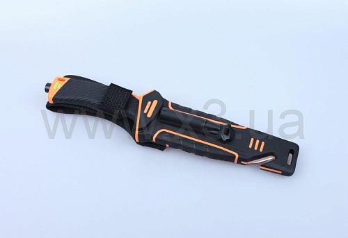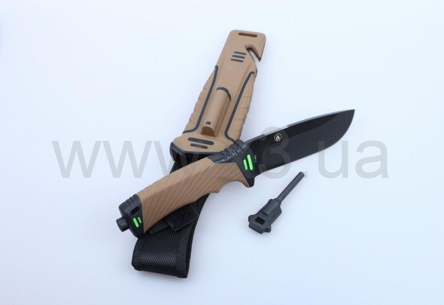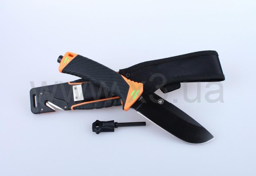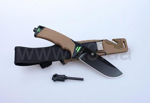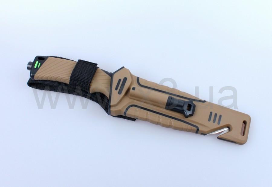 Очень важный элемент в этой модели — чехол для ножа. Он сделан из пластика и нейлона, а потому отлично защитит и нож от повреждений, и владельца ножа от случайных ранений или порчи остального снаряжения. С тыльной стороны чехла встроена точилка с алмазным напылением, которая поможет возобновить остроту гладко заточенного участка. Помимо того, в чехле есть стропорез, а с обратной от точилки стороны встроено огниво, которое можно вынуть и использовать самостоятельно.