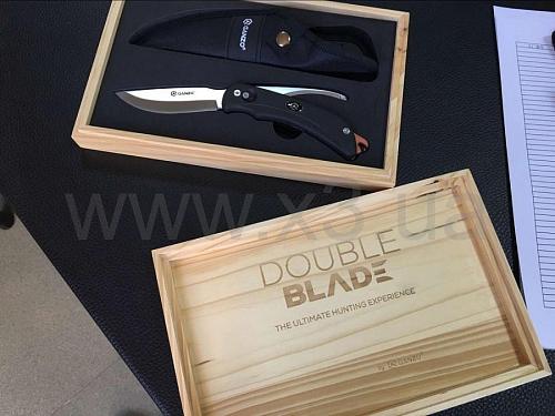 Двойное лезвие ножа Ganzo G802 существенно выделяет его среди остальных ножей этого бренда. Клинки в этой модели сделаны из одной пластины стали и могут поворачиваться вокруг оси в основании рукоятки. Длина клинков одинаковая и составляет 9 см, при ширине обуха 3 мм. Они сделаны из нержавеющей стали, легированной для придания большей стойкости к коррозии и твердости при закалке. Твердость этого металла достигает уровня 57 HRC. Режущая кромка для обоих клинков заточена одинаково — гладко. Этот тип заточки признан универсальным и подходит для выполнения самых разных работ. Зато форма лезвий существенно отличается. Одно из них имеет привычные очертания «финки», а другое вогнуто и получило закругленный не заточенный кончик.