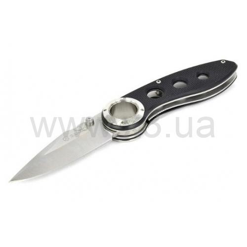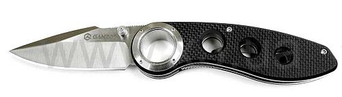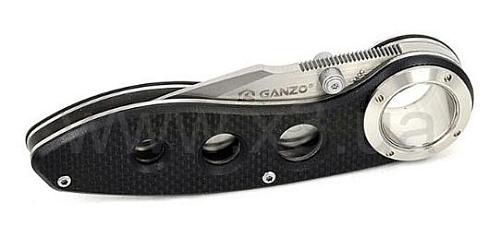 Ganzo G708 — компкатный нож с отверстием в виде кольца между рукояткой и клинком. Продев палец в кольцо, нож удобно удерживать в руке во время работы. На клинке есть шпенек, с помощью которого можно открыть лезвие одной рукой.