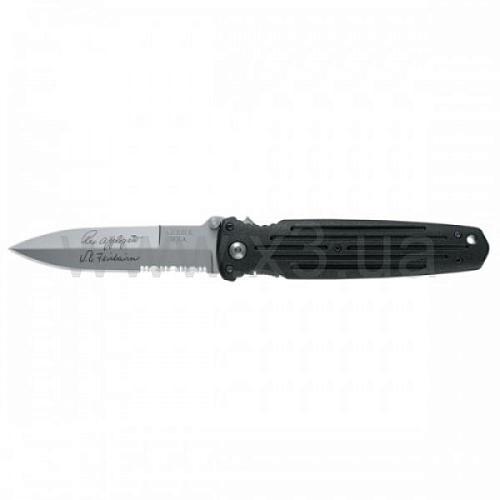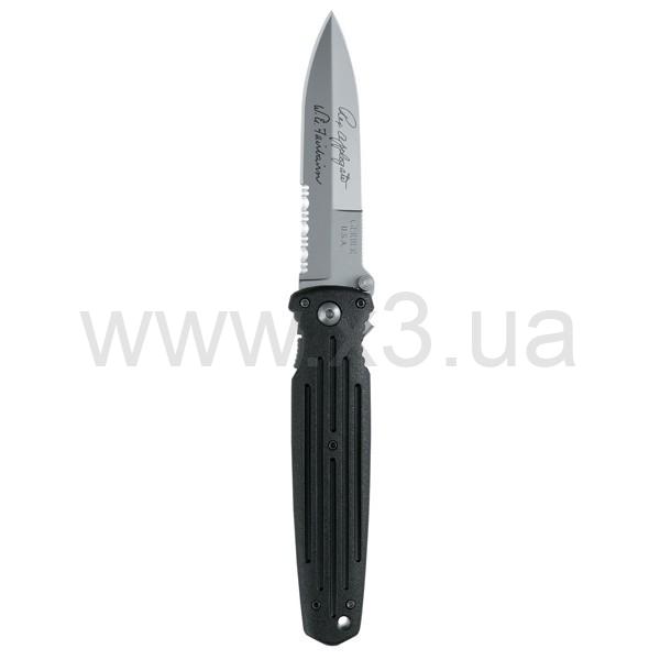 Обоюдоострое лезвие из высокоуглеродистой нержавеющей стали имеет сектор с серрейторной обработкой. Простая традиционной формы рукоять ножа обеспечивает легкость, прочность и твердость сцепления. Тяжелая сплетенная ткань стекловолокнистого нейлона рукояти первоначально была разработана для использования в пуленепробиваемых бронежилетах.