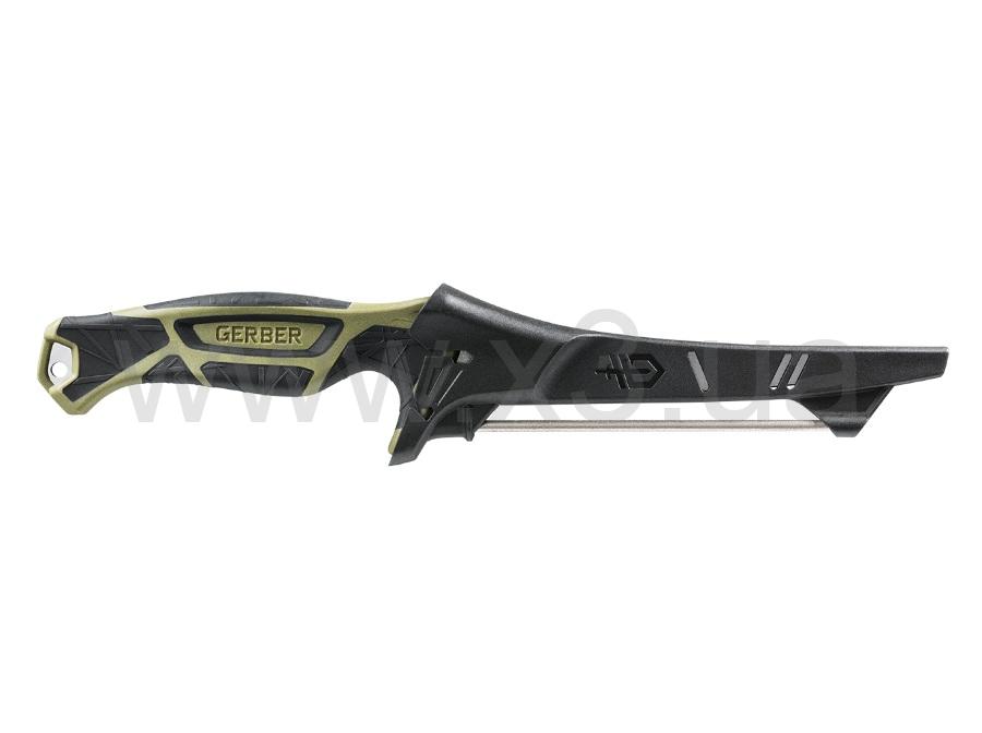 В хвостовой части ножа есть отверстие, чтобы к Gerber Controller 10" можно было прикрепить темляк. Также этот нож можно носить на рюкзаке, на ремне. Чтобы эту модель было удобно брать с собою на рыбалку или в другие поездки на природу, он продается с ножнами. Этот элемент выполнен из пластика и полностью закрывает весь клинок. На ножнах сделано несколько отверстий, чтобы внутри не накапливалась влага. Важной особенностью модели Gerber Controller 10" является наличие в комплекте точилки для ухода за режущей кромкой. Она встроена в ножны и может использоваться буквально в любых условиях.