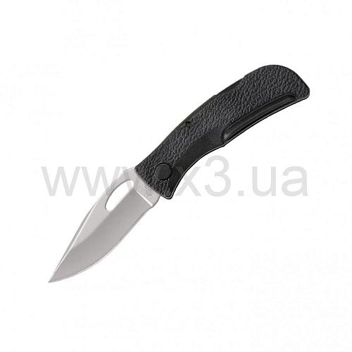 Gerber E-Z — это небольшой складной нож, подходящий как для повседневного использования, так и для поездок на природу. Он сделан из углеродистой нержавеющей стали. Благодаря легирующим добавкам, она является одновременно твердой и стойкой к ржавлению. Поэтому уход за ножом потребуется самый минимальный. Клинок в данной модели сделан формы clip point. У него хорошо сбалансированное острие и гладко заточенная (Fine Edge) кромка. В верхней части лезвия, ближе к рукоятке, имеется продолговатое отверстие для открывания ножа. Кстати, открыть нож можно обеими или одной рукой. Размер клинка составляет только 6 см, но он в состоянии выполнить все основные работы. В открытом положении его удерживает замок Lock Back. Это надежный механизм на основе рычага, по форме напоминающего миниатюрное коромысло.