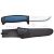 Для изготовления лезвия, использована нержавеющая сталь, произведенная по секретному рецепту компании, и обладающая твердостью 56-58 пунктов по шкале Роквелла (HRC), что, безусловно, сказывается на показателях прочности и износостойкости, а также позволяет ножу долго удерживать остроту. Для эргономичной рукоятки использован черный прорезиненный пластик и вставка синего цвета, на которой выгравирована надпись Morakniv. В области сочленения лезвия и рукоятки, имеется удобный упор, чтобы рука при работе не соскочила и не попала на острое лезвие.
