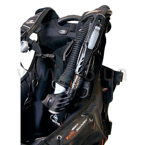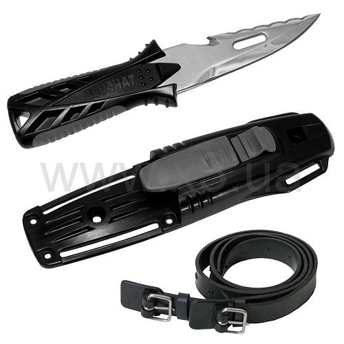 Маленький многоцелевой нож который может крепится как на BCD, так и ремнями на любое удобное Вам место, включая шланги снаряжения. К достоинствам можно отнести небольшой размер: лезвие длинной 83 мм и толщиной 4 мм выполнено из нержавеющей стали. Ручка имеет антипроскальзывающие вставки. Ножны с двойной фиксацией. Не смотря на миниатюрные размеры, нож имеет лезвие со стропорезом и пилообразную верхнюю кромку. Эластичные ремни с дополнительными принадлежностями для крепления на шланге входят в комплект поставки.