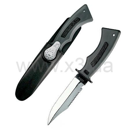 Крепкое лезвие длиной 120 мм гладкое с одной стороны и с частично зазубренным краем с другой стороны, на которой имеется паз для разрезания сети.