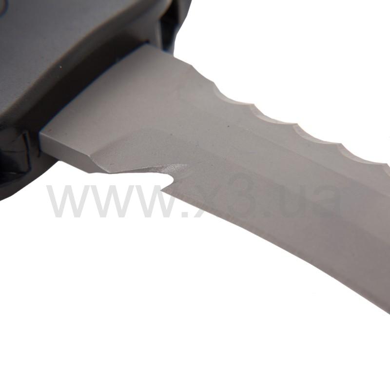 Универсальный нож с обоюдоострой заточкой. С одной стороны – острая режущая кромка, с другой – пилообразный стропорез. Выполнен из сверхпрочного и легкого титана. Благодаря эргономичной ручке нож удобно ложиться в ладонь. Благодаря уникальной системе фиксации, нож надежно закрепляется в ножнах.