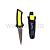 Рукоять и ножны выполнены из пластика с противоскользящими вставками яркого цвета. Кнопка-фиксатор надёжно удерживает нож в ножнах,а также позволяет доставать его одной рукой.