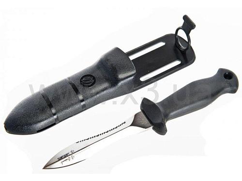 Удлиненная вогнутая линия реза, существенно облегчает разрезание одним движением различного рода шнуров, лесок, сетей - смертельную опасность для подводного охотника.