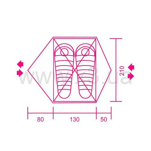Внутреннее помещение палатки, благодаря вставкам из специальной сетки имеет хорошую вентиляцию. Палатка имеет два входа, что очень неплохо для двух человек - не приходится перелазить через друг друга когда надо выйти. Вдобавок ко всему внутри имеются кармашки для мелочей и подвесная полочка .