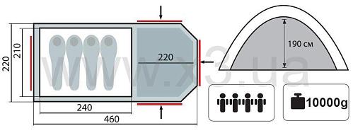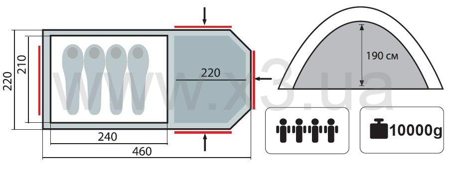 Двухслойная кемпинговая палатка, с двумя входами, большим тамбуром. Два больших вентиляционных окна, все швы палатки проклеены.